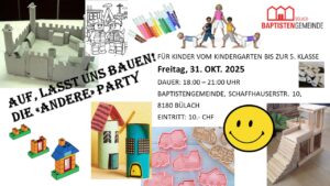 - Auf, lasst uns bauen!, die «andere» PartyAuf, lasst uns bauen!, die «andere» Party, am Freitag, 31. Oktober 2025, 18:00 – 21:00 Uhr, für Kinder vom Kindergarten bis zur 5. Klasse.